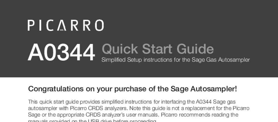 This quick start guide provides simplified instructions for interfacing the A0344 SAGE gas autosampler with Picarro CRDS analyzers. Note this guide is not a replacement for the Picarro Sage or the appropriate CRDS analyzer’s user manuals. Download