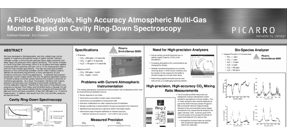 Picarro has developed a field-deployable, real time, ambient gas monitor capable of measuring atmospheric levels of carbon dioxide, methane, hydrogen sulfide, and ammonia with parts-per-billion (ppbv) sensitivity and water vapor with parts-per-million (ppmv) sensitivity. Results from field trials of three different CO2 analyzers at Harvard, Penn State, and the NOAA facility in Boulder CO are shown.