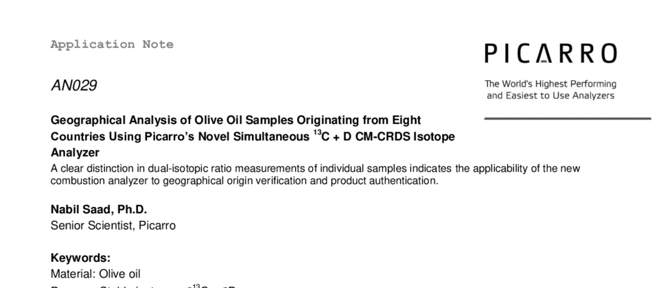 AN029: Geographical Analysis of Olive Oil Samples Originating from Eight Countries Using Picarro’s Novel Simultaneous 13 C + D CM-CRDS Isotope Analyzer