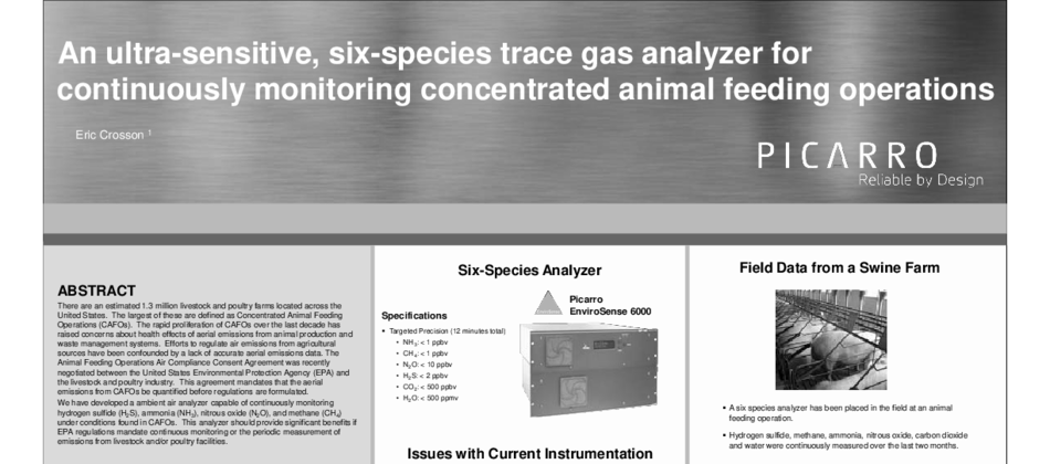 Describes development of and results obtained from an analyzer engineered by Picarro for measuring six important atmospheric contaminants (hydrogen sulfide, ammonia, nitrous oxide, carbon dioxide, water vapor and methane) that are of interest to researchers monitoring Concentrated Animal Feeding Operations (CAFOs).