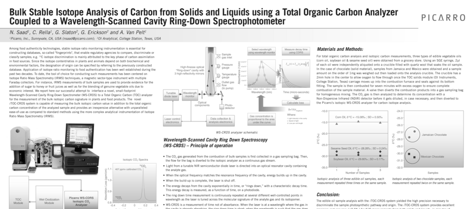 From the EGU 2009 General Assembly, describing measurements of edible oils and chocolates made with Picarro's iTOC-CRDS Isotopic Carbon Analyzer.