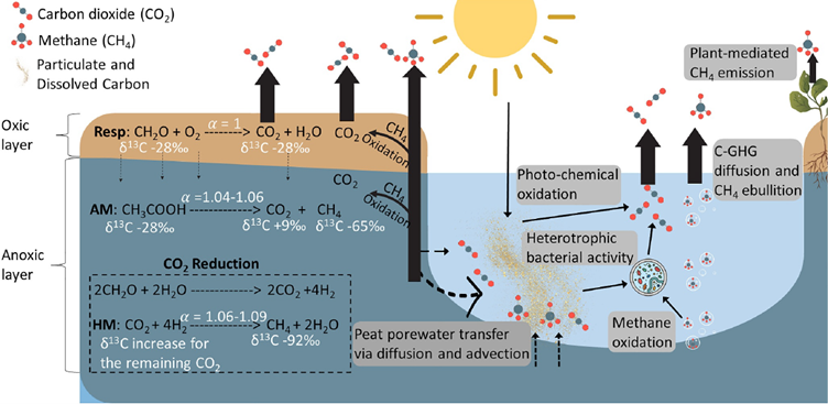 Capturing these dynamics required tracking carbon across multiple phases. The team combined dissolved gas measurements with isotopic and radiocarbon analyses to separate newly produced carbon from deeper, legacy peat carbon. The result is a system where fresh inputs and old carbon are tightly coupled.