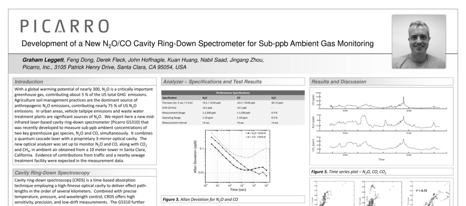 With a global warming potential of nearly 300, N2O is a critically important greenhouse gas, contributing about 5 % of the US total GHG emissions. Agriculture soil management practices are the dominant source of anthropogenic N2O emissions, contributing nearly 75 % of US N2O emissions. In urban areas, vehicle tailpipe emissions and waste water treatment plants are significant sources of N2O. We report here a new mid-infrared laser-based cavity ring-down spectrometer (Picarro G5310) that was recently developed to measure sub-ppb ambient concentrations of two key greenhouse gas species, N2O and CO, simultaneously. It combines a quantum cascade laser with a proprietary 3-mirror optical cavity. The new optical analyzer was set up to monitor N2O and CO, along with CO2 and CH4, in ambient air obtained from a 10 meter tower in Santa Clara, California. Evidence of contributions from traffic and a nearby sewage treatment facility were expected in the measurement data.