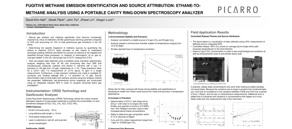Natural gas analysis and methane specifically have become increasingly important by virtue of methane’s 28-36x greenhouse warming potential compared to CO2 and accounting for 10% of total greenhouse gas emissions in the US alone. Determining the specific fingerprint of methane sources by quantifying the ethane to methane (C2:C1) ratios provides us with means to understand processes yielding methane and allows for sources of methane to be mapped and classified through these processes; i.e. biogenic or thermogenic, oil vs. gas vs. coal gas-related. In the US, natural gas has a C2:C1 ranging from 2-5%.
