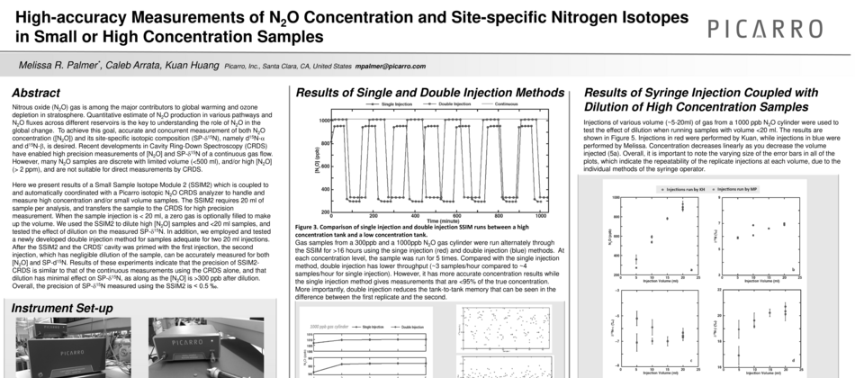 Here we present results of a Small Sample Isotope Module 2 (SSIM2) which is coupled to and automatically coordinated with a Picarro isotopic N2O CRDS analyzer to handle and measure high concentration and/or small volume samples. The SSIM2 requires 20 mL of sample per analysis, and transfers the sample to the CRDS for high precision measurement. When the sample injection is < 20 mL, a zero gas is optionally filled to make up the volume. We used the SSIM2 to dilute high [N2O] samples and <20 mL samples, and tested the effect of dilution on the measured SP-d15N. In addition, we employed and tested a newly developed double injection method for samples adequate for two 20 mL injections. After the SSIM2 and the CRDS’ cavity was primed with the first injection, the second injection, which has negligible dilution of the sample, can be accurately measured for both [N2O] and SP-d15N. Results of these experiments indicate that the precision of SSIM2- CRDS is similar to that of the continuous measurements using the CRDS alone, and that dilution has minimal effect on SP-d15N, as along as the [N2O] is >300 ppb after dilution. Overall, the precision of SP-d15N measured using the SSIM2 is < 0.5‰.