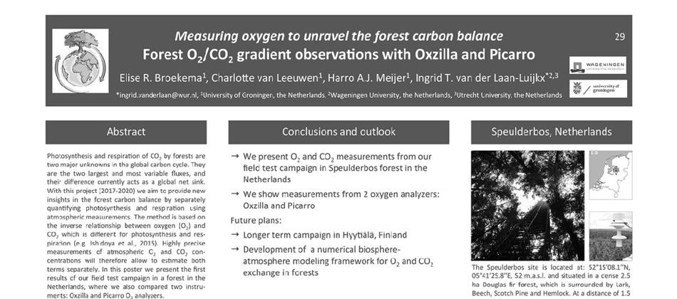 Photosynthesis and respiration of CO, by forests are two major unknowns in the global carbon cycle. They are the two largest and most variable fluxes, and their difference currently acts as a global net sink. With this project (2017-2020) we aim to provide new insights in the forest carbon balance by separately quantifying photosynthesis and respiration using atmospheric measurements. The method is based on the inverse relationship between oxygen (O,) and CO, which is different for photosynthesis and respiration (e.g. lshidoya et al., 2015). Highly precise measurements of atmospheric 02 and CO2 con­ centrations will therefore allow to estimate both terms separately. In this poster we present the first results of our field test campaign in a forest in the Netherlands, where we also compared two instru• ments: Oxzilla and Picarro 02 analyzers.