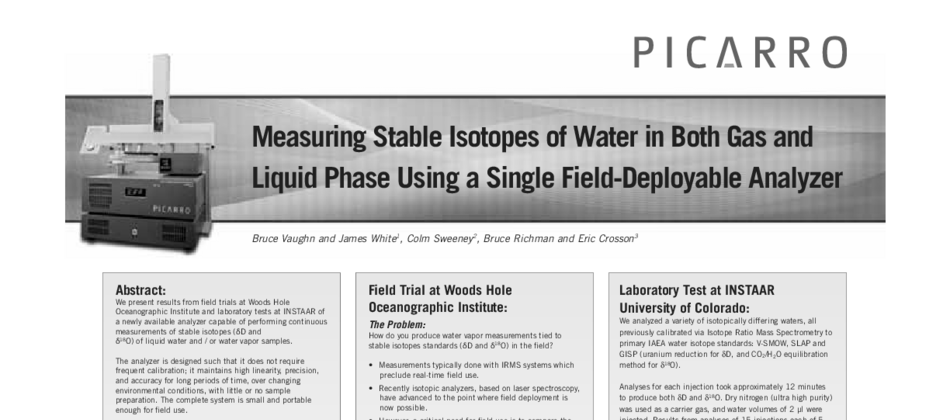 Results presented from field trials at Woods Hole Oceanographic Institute and laboratory tests at INSTAAR of a newly available analyzer capable of performing continuous measurements of stable isotopes (δD and δ18O) of liquid water and / or water vapor samples.
