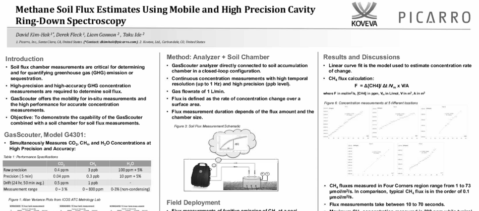Methane is a potent greenhouse gas that has a short-term global warming impact. It comes from a variety of natural and anthropogenic sources which include wetlands, landfills, oil/gas/coal extraction activities and natural gas distribution leaks. Locating and containing these emissions are critical to minimizing their environmental impacts and economically beneficial when retrieving large fugitive amounts. Generally, methane detection is conducted by making real-time atmospheric measurement and identifying large variations from the typical atmospheric concentration of 2 ppm. The measurement technique is well-developed and includes catalytic sensors and laser analyzers. On other hand, soil emission quantification (flux) is not a direct measurement as it is calculated based on rate of gas accumulation in a known chamber volume. In this case, high-performance analyzers are required to provide high temporal resolution and high-precision in situ measurement of the concentration. Here we present a highly-efficient method of measuring methane emission flux using the latest portable and lightweight Cavity Ring-Down Spectroscopy analyzer and a mobile accumulation chamber. The system enables rapid measurement (~1 minute) in a wide range of emission flux. We will present supplemental data acquired from a soil flux measurement campaign at a coal outcrop site in the Four Corner region