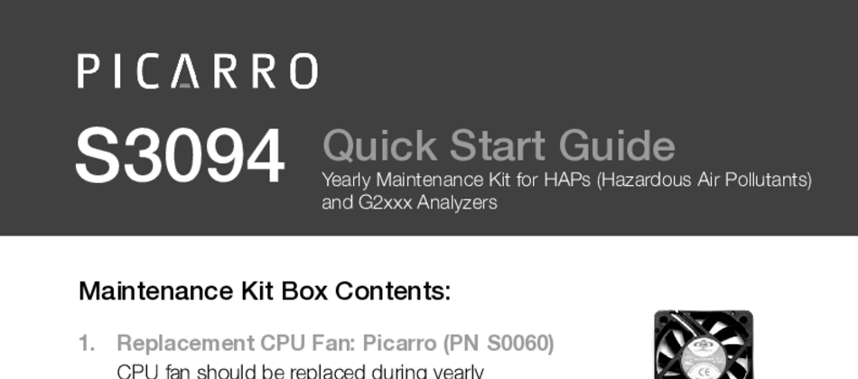 This is yearly maintenance kit quick start guide for Picarro's HAPs G2xxx analyzers.
