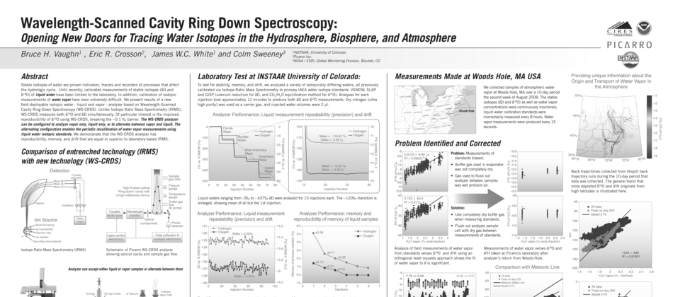 Describes work by INSTAAR, NOAA & Picarro on both liquid water and water vapor measurements of stable water isotopes. Source AGU 2008 Fall Meeting Download