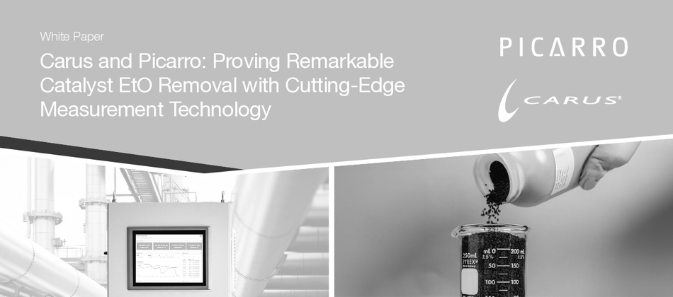 This white paper describes destruction efficiency testing run by Carus and Picarro, Inc. on Carus’s CARULITE® 500 catalyst media using Picarro’s Ethylene Oxide (EtO) Cavity Ring-Down Spectrometer (CRDS) technology. Picarro’s technology provides industry-leading sensitive, accurate, and virtually drift free measurements at levels reaching below a part per billion, making it an excellent choice for studies where high levels of destruction efficiency need to be characterized and confirmed. Measurements were run in a lab setting using an EtO standard blended to between 100 and 1000 ppm—concentrations typically seen by Catalytic Oxidizer systems during active batch sterilization. We describe a tracer method using CH4, H2O, and CO2 to confirm flow of the process gas to the analyzer, and we show that CARULITE® 500 handily outperforms even the strictest regulatory standards in both destruction efficiency and effluent concentrations, with average observed destruction efficiency of 99.99988% and average outlet concentrations of 0.2 ppb across inlet concentrations.