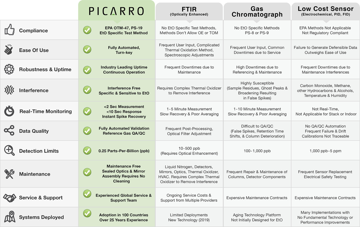 Picarro cavity ring-down spectroscopy (CRDS) systems are trusted for their unmatched accuracy and reliability, thanks to advanced laser control and stable operating conditions. Our patented wavelength monitor (WLM) keeps the laser precisely tuned, ensuring highly accurate gas absorption measurements. At the same time, the system maintains tightly controlled temperature and pressure, with an insulated, actively heated sample chamber and automated pressure adjustments. This combination minimizes errors and ensures consistent, reliable results, offering a clear advantage over traditional methods like FTIR and GC systems.