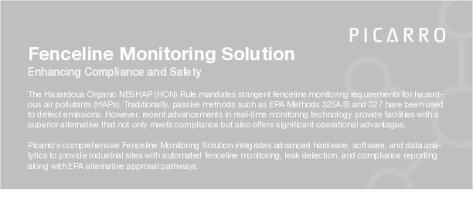 Picarro’s comprehensive Fenceline Monitoring Solution integrates advanced hardware, software, and data analytics to provide industrial sites with automated fenceline monitoring, leak detection, and compliance reporting along with EPA alternative approval pathways.