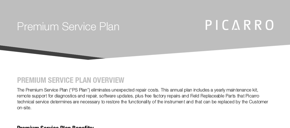 The Premium Service Plan* (“PS Plan”) eliminates unexpected repair costs. This annual plan includes a yearly maintenance kit, remote support for diagnostics and repair, software updates, plus free factory repairs and Field Replaceable Parts that Picarro technical service determines are necessary to restore the functionality of the instrument and that can be replaced by the Customer on-site.